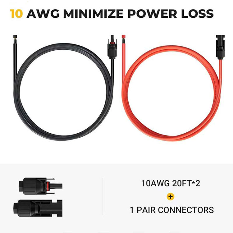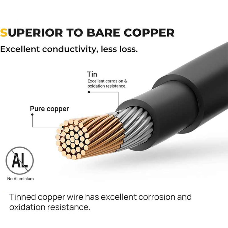 צמצם את אובדן הכוח: עשוי עם קופר טהור מצופה בדיל, לכבל קופר טהור המצופה בדיל יש מוליכות חשמלית טובה, בהשוואה לחוטי נחושת חשופים, עמידות הקורוזיה וביצועי החמצון שלו חזקים יותר, וגם יכולים להאריך מאוד את חיי השירות של כבלים. בהשוואה לכבלי 14AWG ו-12AWG, שימוש בכבל מאריך סולארי של 10AWG יכול למזער את אובדן החשמל במערכת הפאנלים הסולאריים שלך.