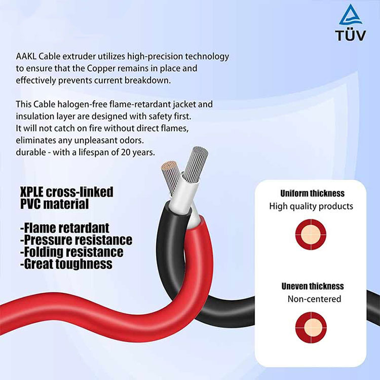 עמידות: כבל שמש מאריך זה מיועד לשימוש ארוך טווח בחוץ ועמיד בפני טמפרטורות גבוהות ונמוכות כאחד, קרני UV, אש, כוחות מתיחה ובלאי. כבל תיל PV Solar זה צפוי להחזיק מעמד עד 20 שנה.